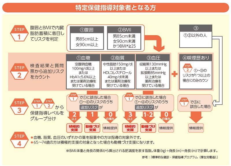 40歳から74までの方で、血圧、脂質、血糖などの健診結果から生活習慣病になる可能性が高い場合、保健師・管理栄養士などの専門職による無料の生活改善サポート「特定保健指導」の対象となります。